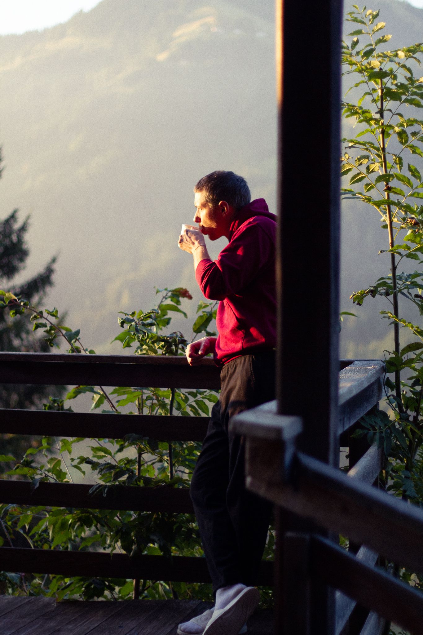 Um mich abzureagieren, gehe ich kurz vor die Tür. Ich schaue über die saftigen Weiden, im Tal hängen noch Nebelschwaden, die Morgensonne fällt auf mein Gesicht. Sogar, wenn ich mir Mühe geben würde, könnte ich jetzt keine schlechte Laune mehr haben. Ich mache mir erst einmal einen Kaffee und beschließe, das Projekt einfach schriftlich per Mail zu präsentieren. Vielleicht ist das ja eh besser so. Im gescheiterten Zoom-Call hatte ich von meinem Kunden nur zwei Fragen verstanden. Warum eigentlich die Decke in meinem Büro so niedrig ist? Und wieso ein Kruzifix hinter mir hängt?