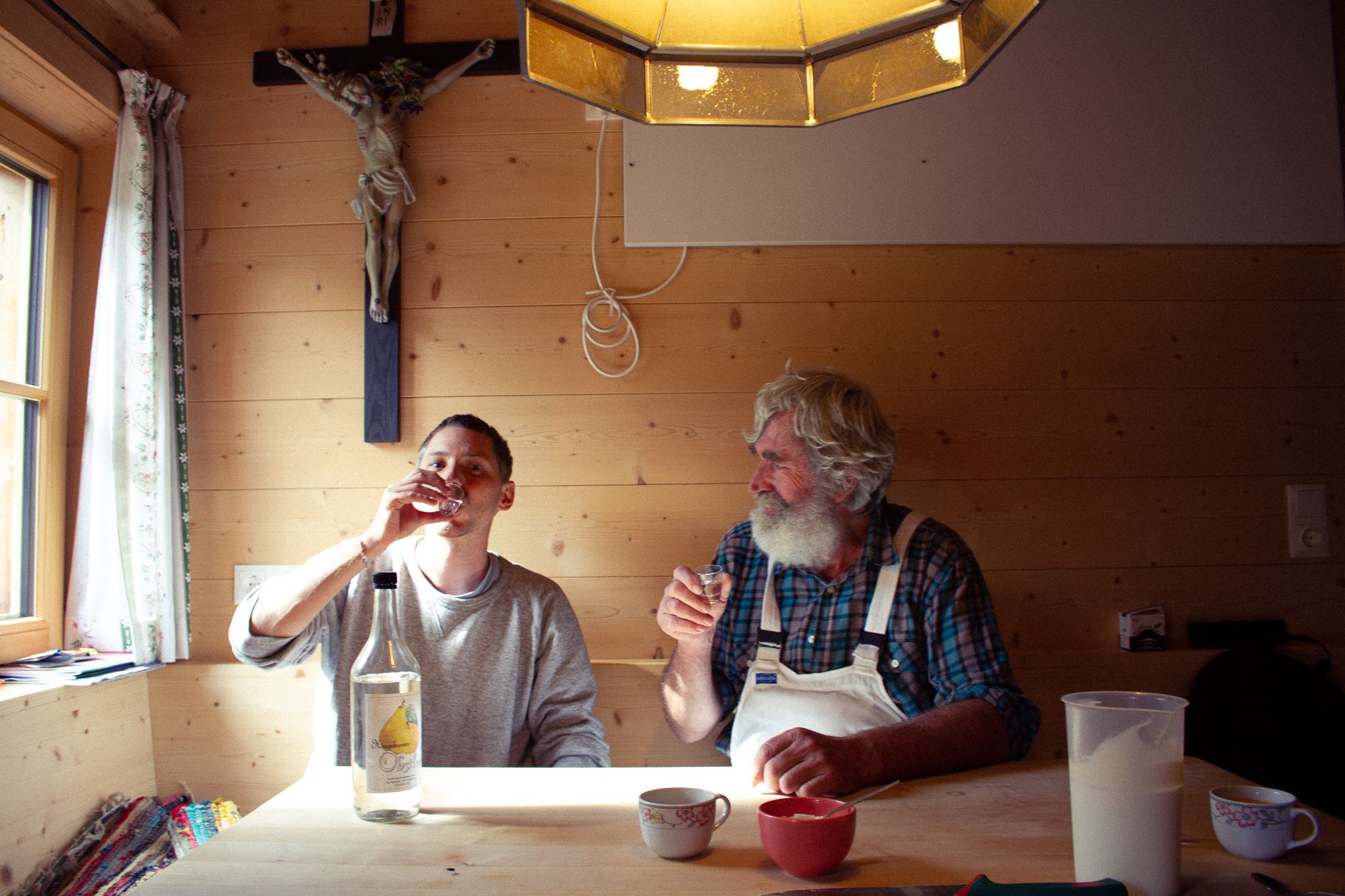Die Moser Maria, eine sympathische Frau im Rentenalter, hat einen äußerst festen Händedruck und strahlt so viel Lebensfreude, Energie und gute Laune aus, dass ich, ein Mann in seinen besten Jahren, mir daneben ganz schach vorkomme. Zuallererst muss ich ein Glas Schnaps mit ihr trinken, weil man das hier halt so macht. Nach einem längeren Plausch und noch einem Schnaps zeigt sie mir den Weg zu meiner Hütte, die ein wenig über dem Haus der Mosers liegt und die man nur mit dem Traktor oder zu Fuß erreichen kann (ich bin ein bisschen erleichtert, dass niemand von mir erwartet, dass ich den steilen Weg mit meinem Mietwagen bezwinge).