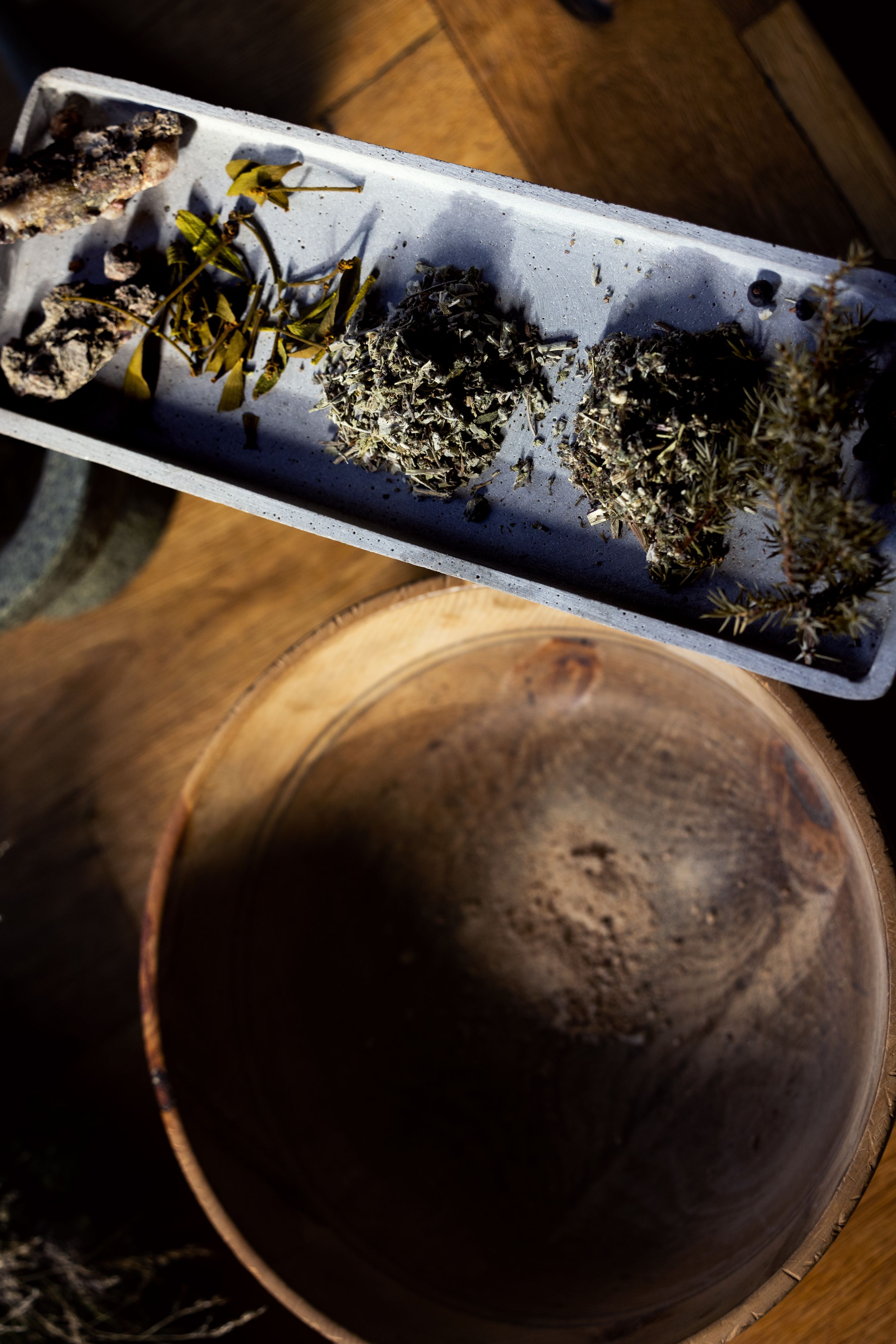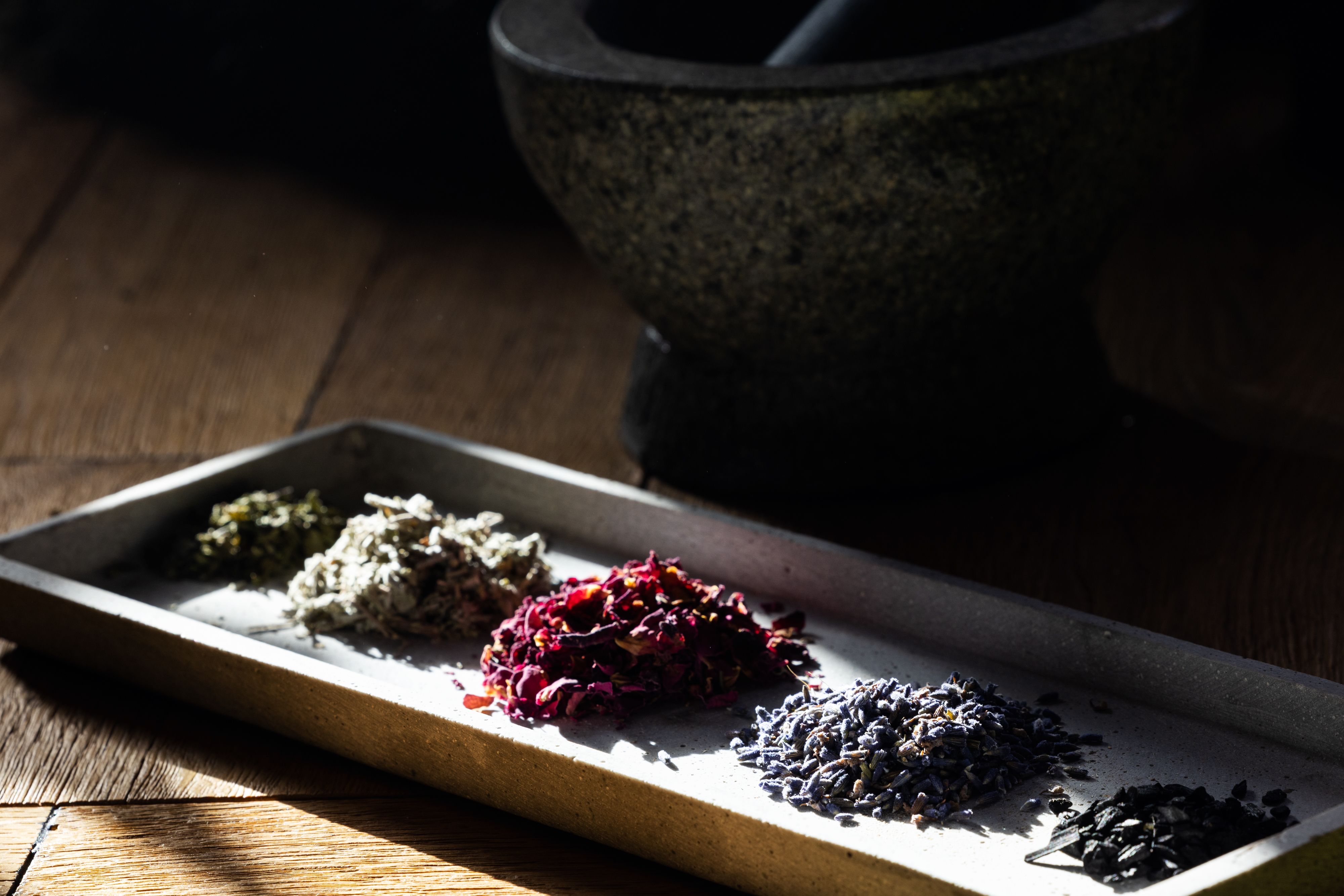 Die Zutaten für die Rauhnachtssmischung (von links nach rechts): Fichtenharz, Mistel, Salbei, Beifuß und Wacholder. Das Harz muss vor dem Vermengen im Mörser pulverisiert werden.